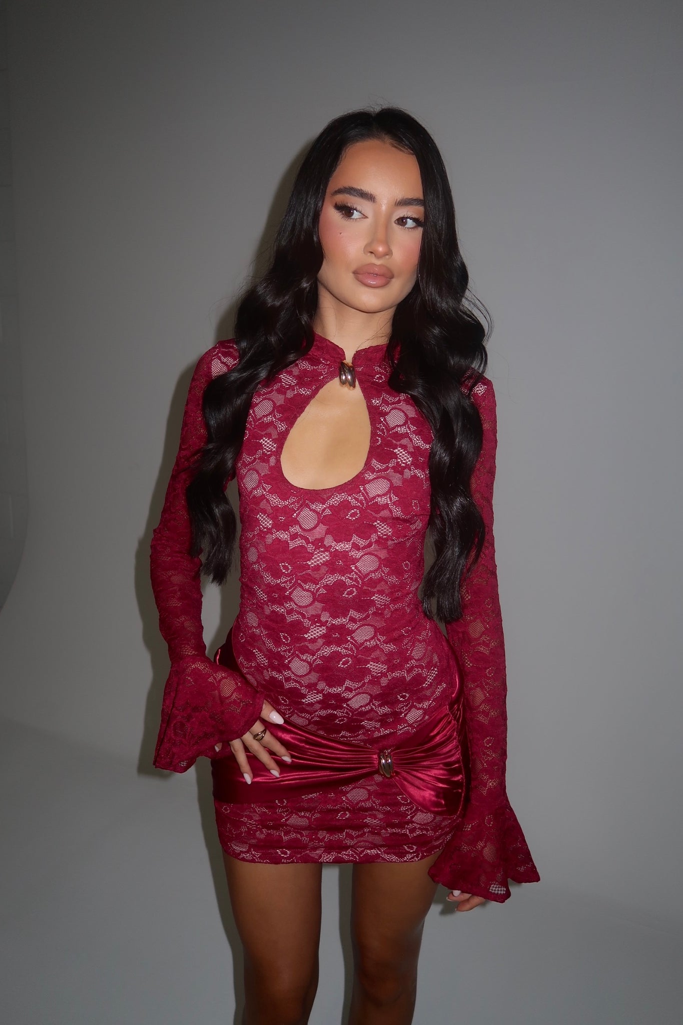 Introducing our exclusive ‘Cleopatra’ lace dress. Fully lined and crafted from burgundy lace, this mini dress features opal cut outs, a satin wrap, and stunning gold brooches. f Perfect for autumn/winter nights out and occasions.