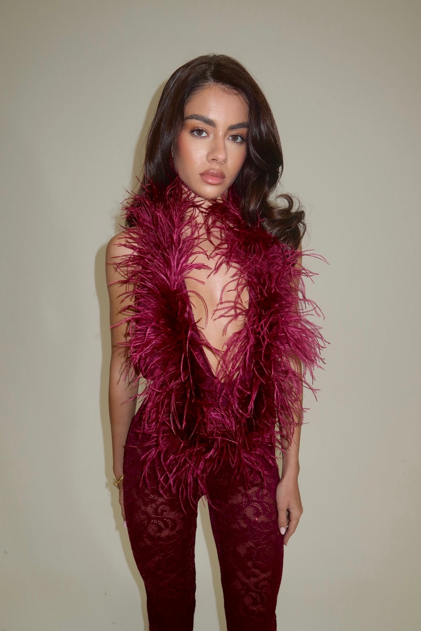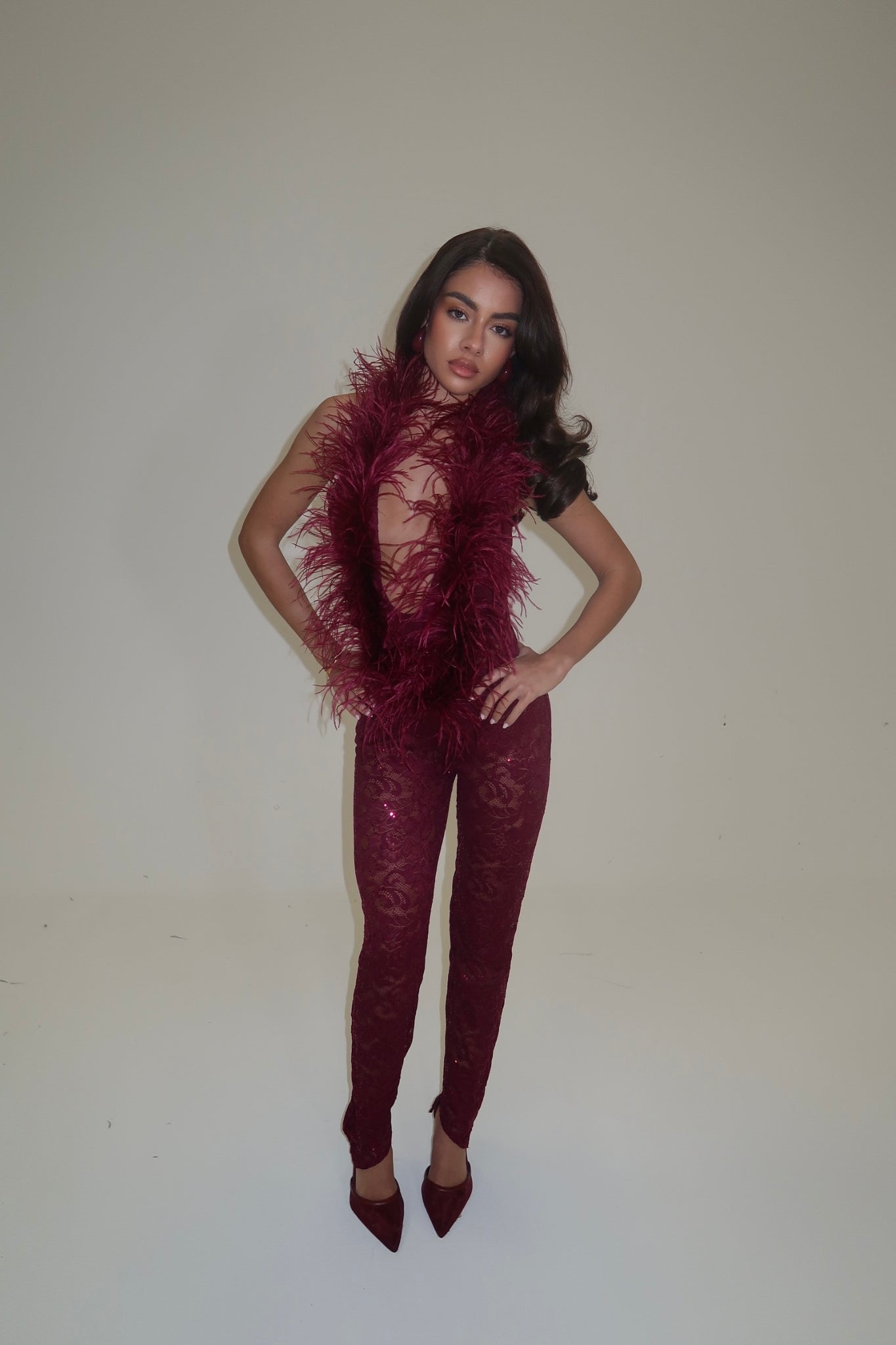 Crafted with premium ostrich feathers and sequin lace. Backless halter neck ostrich feather jumpsuit with a split hem flared ankle. Perfect for the extra girlies who love to turn heads and make a statement.
